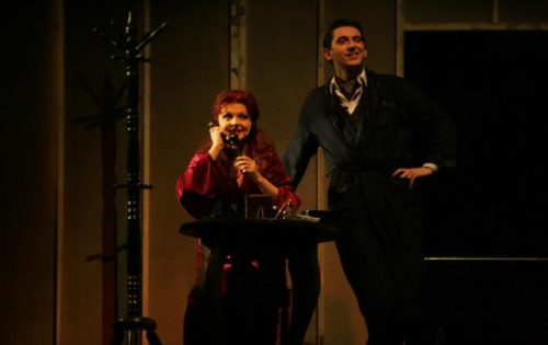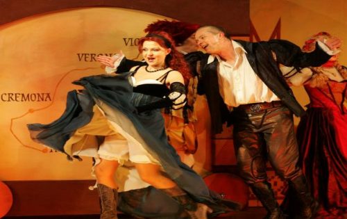 Three laureates of the Golden Stage Cross (Aidas Giniotis, Vilma Dabkienė and Vesta Grabštaitė) are the initiators of Kiss me, Kate production. A story within a story is a challenge for directors and a great entertainment for the audience. People have the possibility to watch the process of the performance created on the stage and another story line within it. Kiss me, Kate develops a story of two divorced artists: Lilli Vanessi and Fred Graham who meet in a theatre in order to create the characters (Petruchio and Katherine). Petruchio and Katherine are the characters from Shakespeare’s Taming of the Shrew. Both characters are very similar to Lilli Vanessi and Fred Graham in their temperament, so it is very interesting to watch the double performance on the stage.