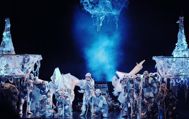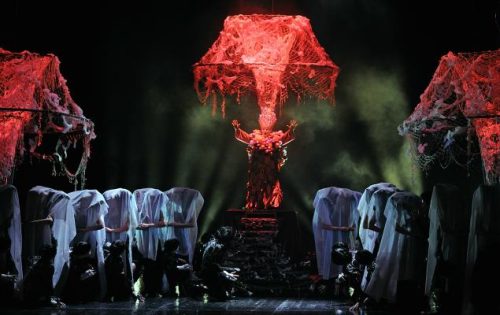 Šio pastatymo kūrėjai ėmėsi eksperimento. Scenografiją ir kostiumus jie kūrė pankiškai: išradingumas – maksimum, priemonių kaina – minimum. Jaunas scenografas ir kostiumų dailininkas Madis Nurmsas juodoje teatro scenoje tarsi pinkles pakabino tris apskurusius kūgio formos tinklus. Kiekvienas jų pritvirtintas prie trijų lankų, tad galėjo keisti savo formą, taip pranešdamas veiksmo erdvės pasikeitimą. Tinklus apšviečiant šiltų arba šaltų spalvų prožektoriais, kuriamos skirtingos nuotaikos. Centre pastatyta pakyla didingiesiems, į kurią veda tuo pačiu tinklu-pinklėmis užkloti laiptai. Abstraktus, neperkrautas scenovaizdis skatina vaizduotę, o scenoje lieka daug erdvės, kurią choreografinėms kompozicijoms puikiai išnaudojo choreografas Olegas Titovas.